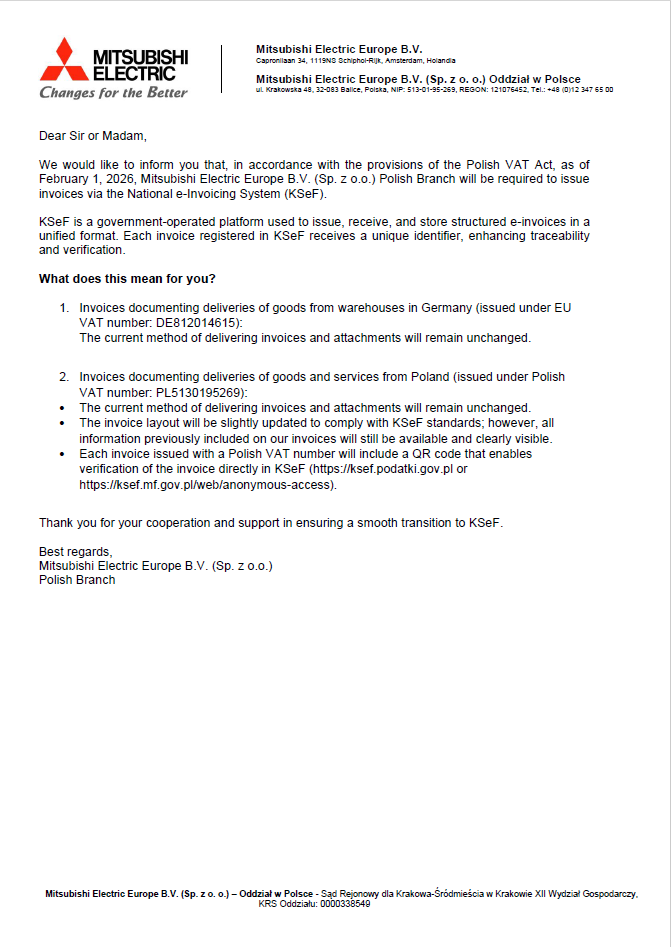 Krajowy System E-Faktur Strona główna » Warto wiedzieć » Krajowy System E-Faktur KRAJOWY SYSTEM E-FAKTUR Szanowni Państwo,Uprzejmie informujemy, że zgodnie z przepisami ustawy o VAT, od 1 lutego 2026 r. Mitsubishi Electric Europe B.V. (Sp. z o.o.) Oddział w Polsce będzie zobowiązany do wystawiania faktur za pośrednictwem Krajowego Systemu e-Faktur (KSeF).Więcej informacji znajdą Państwo na www.ksef.podatki.gov.pl Dokumenty do pobrania Oficjalny komunikatKliknij w obrazek, aby otworzyć Official AnnouncementKliknij w obrazek, aby otworzyć